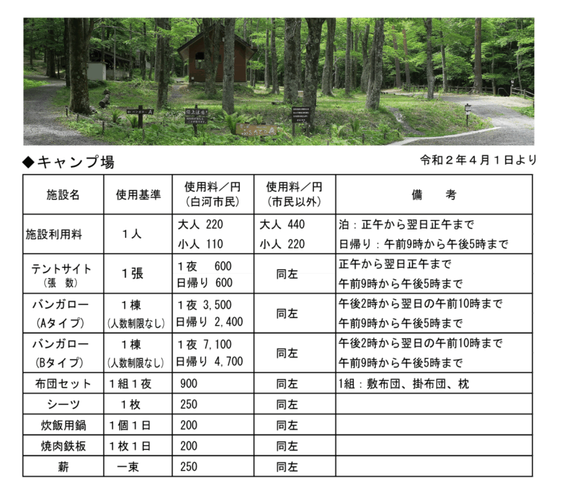 施設使用料 2020.05.082025.10.17 ※令和5年4月1日(土)より西白河郡内の町村のお客様は白河市民料金でご利用できます。 ※テントサイトは張数に応じて料金が変わります。張数(総数)でご予約ください。 ※令和5年4月1日(土)より西白河郡内の町村のお客様は白河市民料金でご利用できます。 ※令和5年4月1日(土)より西白河郡内の町村のお客様は白河市民料金でご利用できます。