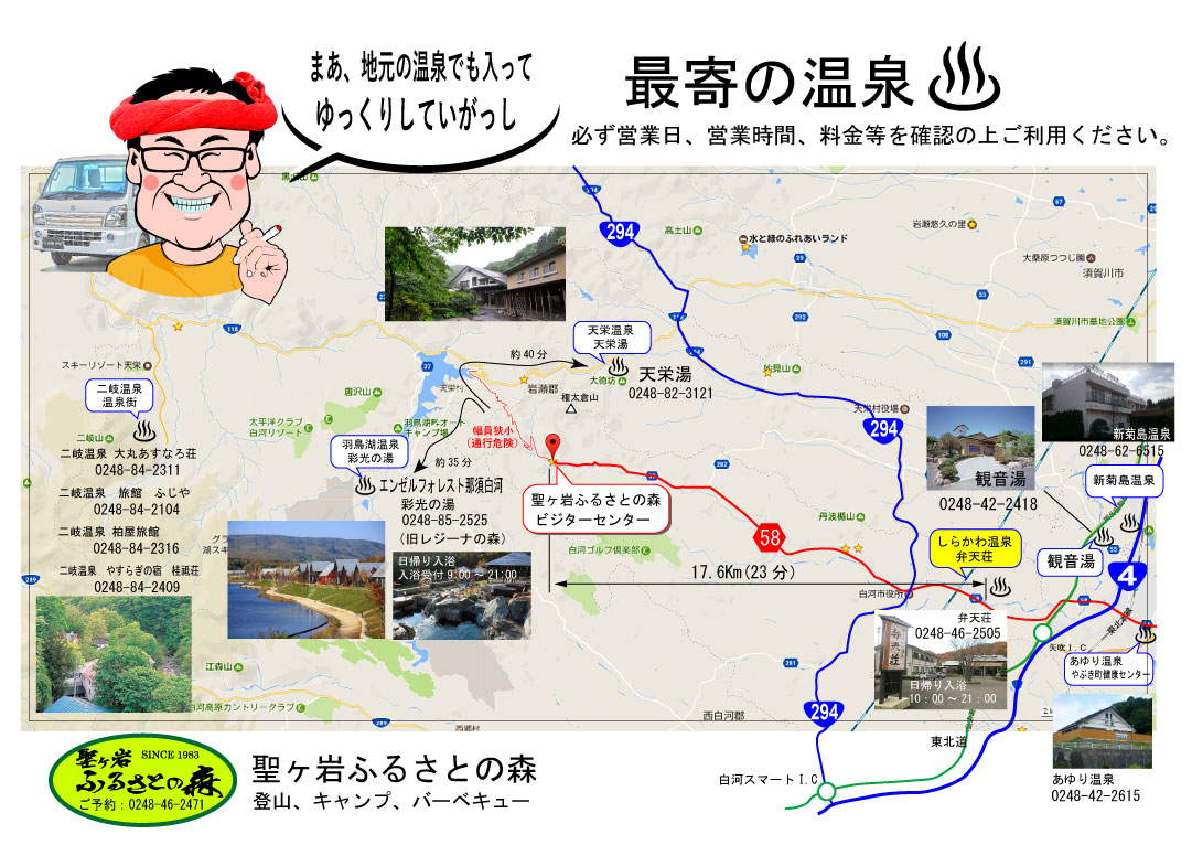 ・エンゼルフォレスト 彩光の湯 〒962-0623福島県岩瀬郡天栄村羽鳥湖字高戸屋39 0248-85-2552